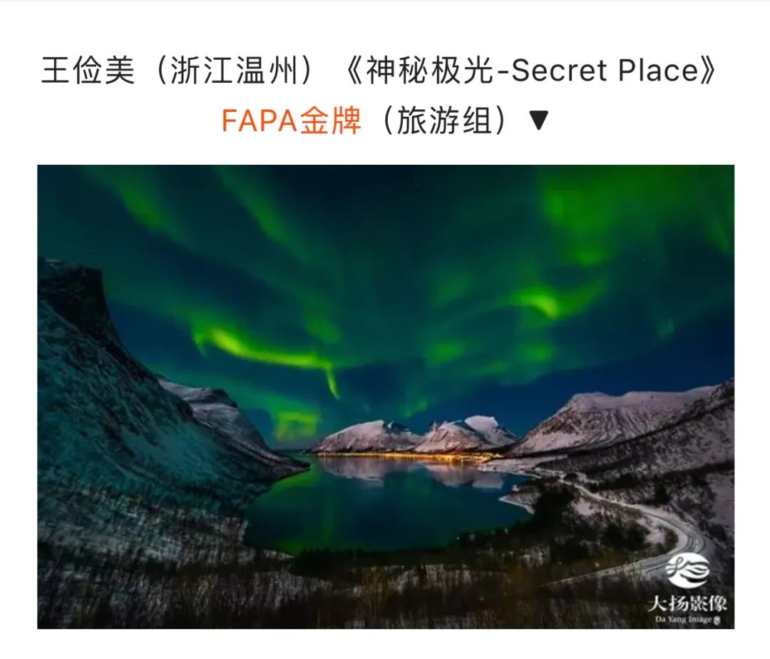 本人摄影作品再次获奖。尤为高兴的是那些名不见经传的作品能够进入入选名单,深受鼓舞!2022年第十一届中国台中国际摄影艺术展获奖揭晓,赛事由台中市摄影学会主办,经FIAP (国际摄影艺术联合会)、GPU(国际摄影家联盟)等共同认证。本人摄影作品《神秘极光 - Secret Place》荣获FAPA金牌(旅游组)(图1-2)。