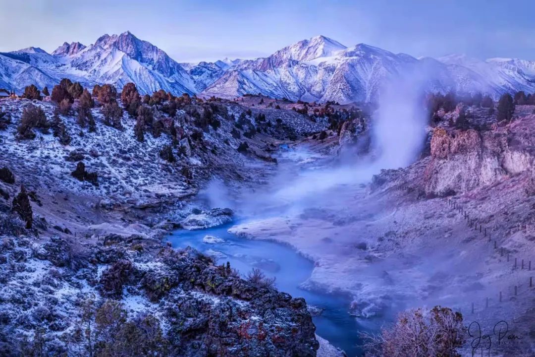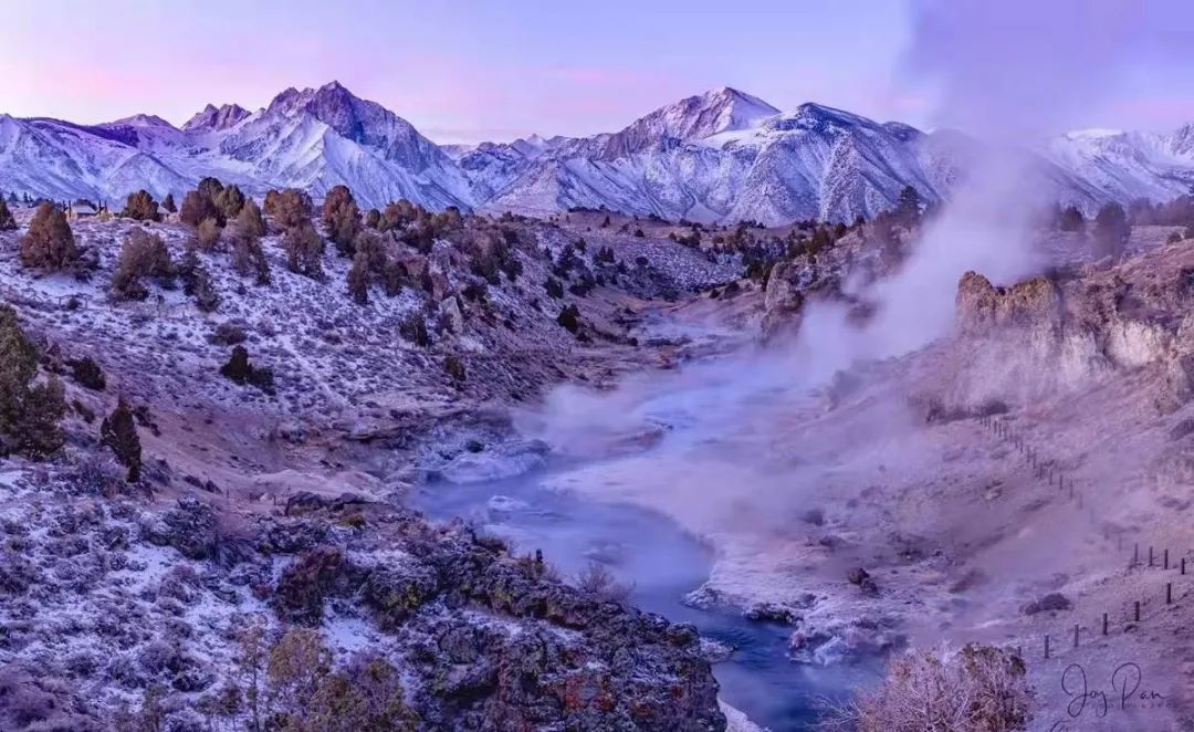 我们在这里停留2个晚上,去了两趟这条热泉溪流。2年前秋天来过,当时就想,这个地方要有雪多好。纽约的影友肯定会说,要有个月亮更好。他们如今是无月不拍。我们等来了一抹红云,淡淡的,没有盖过雪山的清冷。热气忽浓忽淡,随风飘散。有人下水泡温泉,一定希望我们拍她?可惜我们的注意力都在天空、雪山、温泉、溪流和云影。嘘,不要破坏这份宁静和美好。Mammoth Lake, CA, 第四次光顾了,我还会再来。