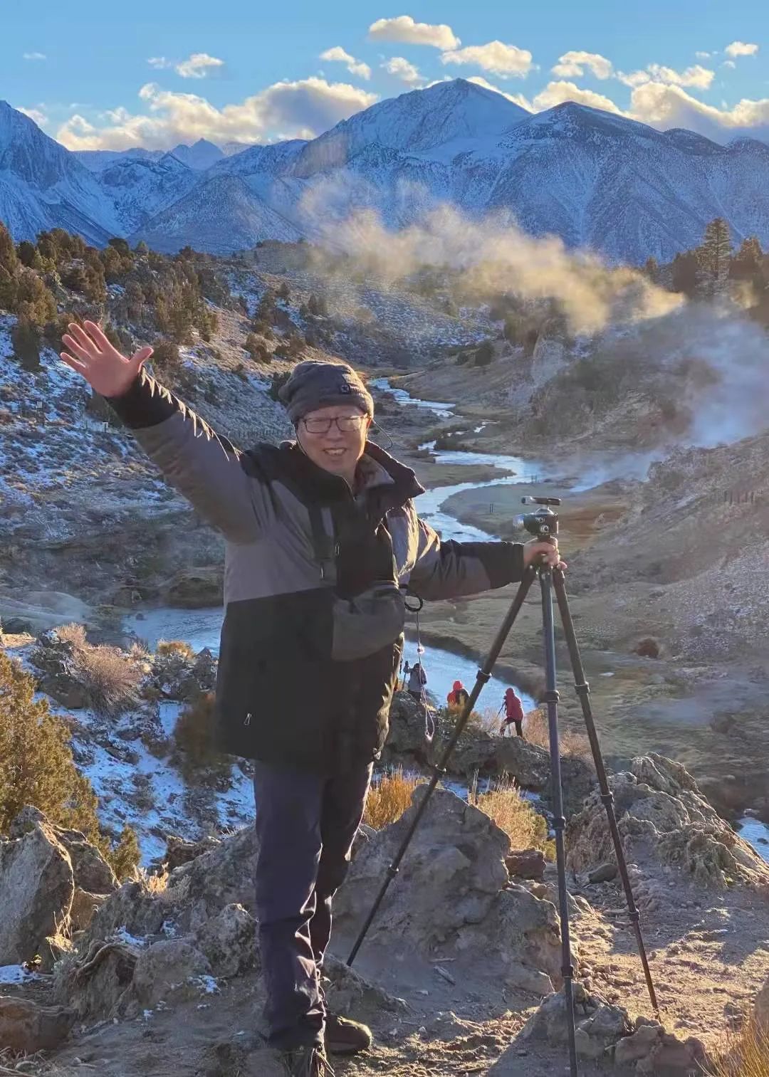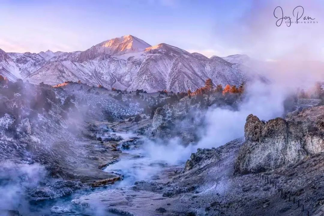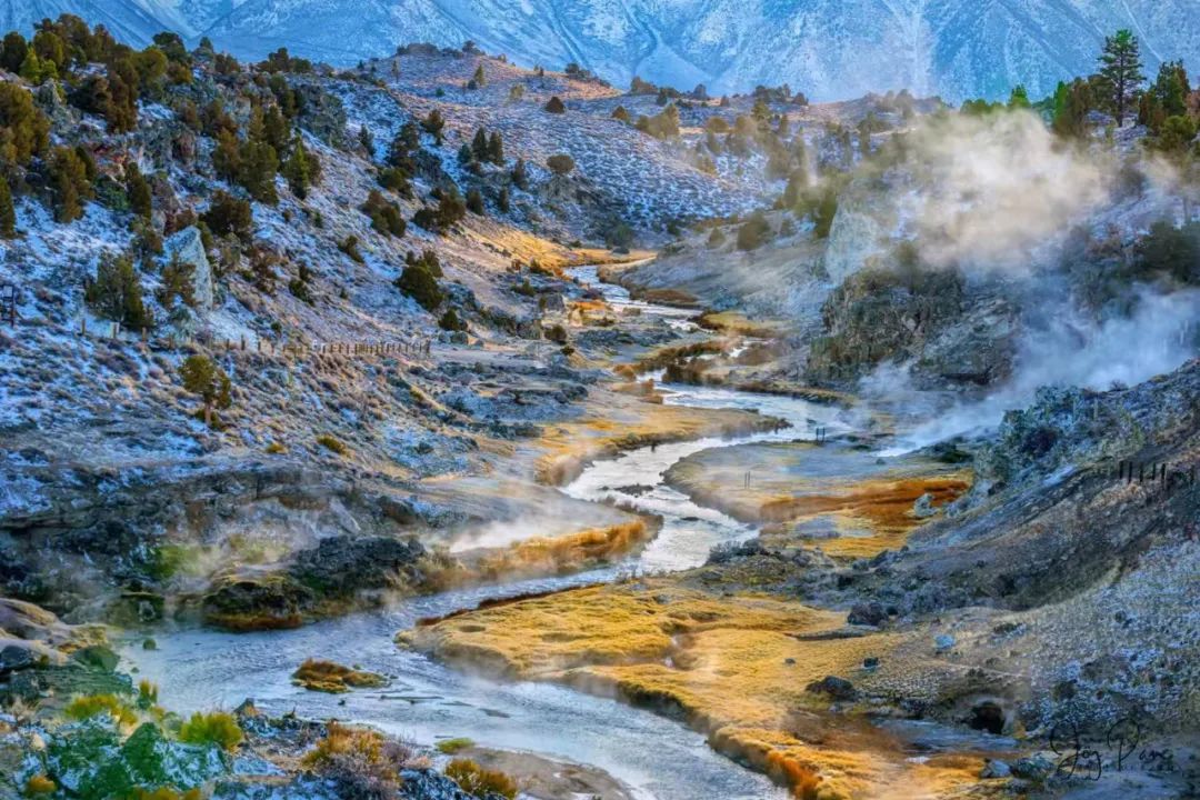 猛犸象湖采风偶遇大雪。其景观以石灰石台阶为主,也称热台阶区。如下两图图是我们此行的目标画面: 热泉溪流,雪山做背景,天然热泉氲气蒸腾,S型的溪流蜿蜒流淌着冒烟的热气。