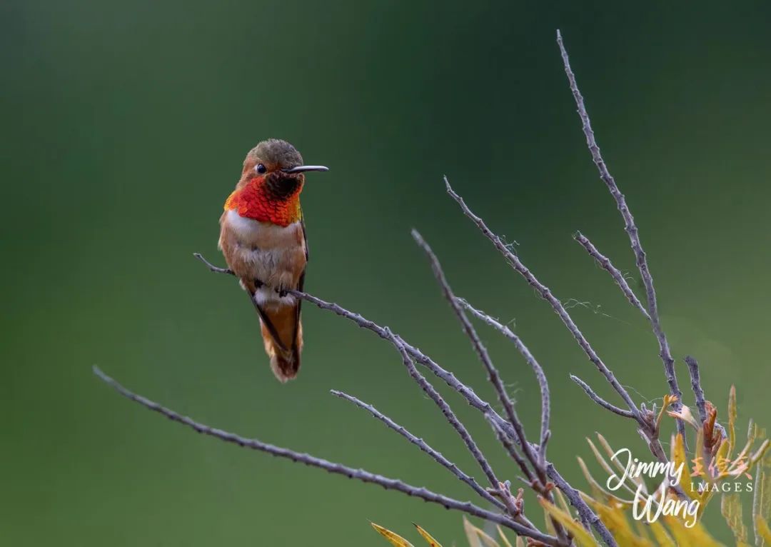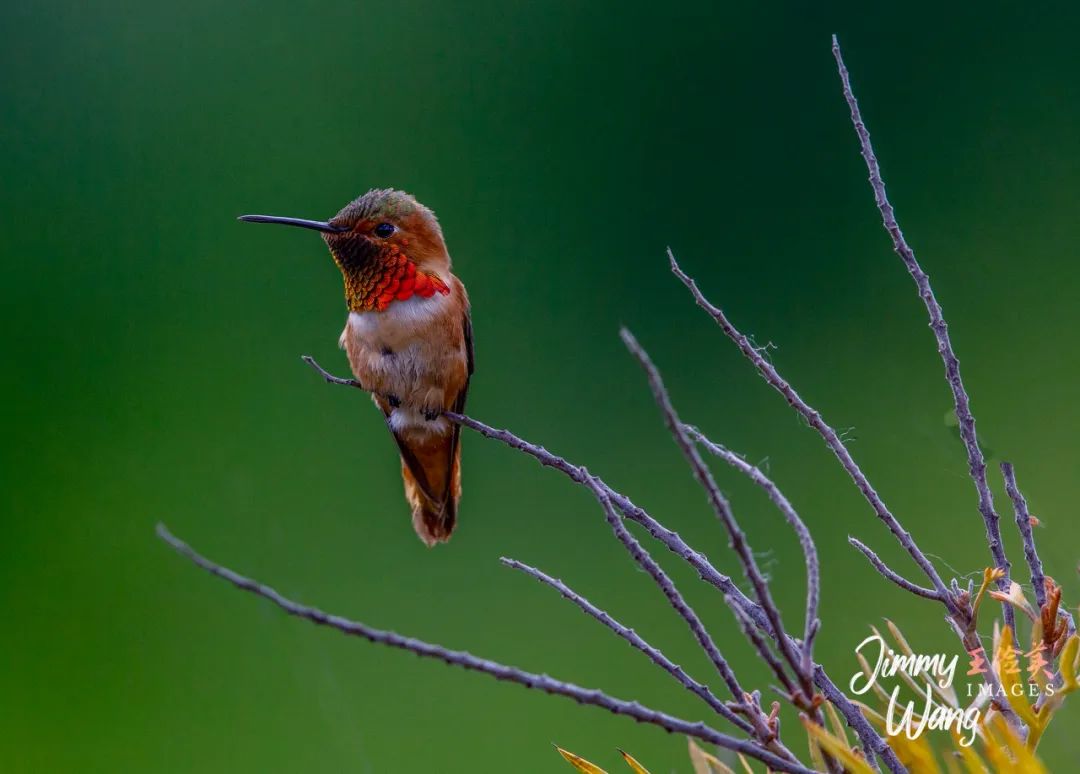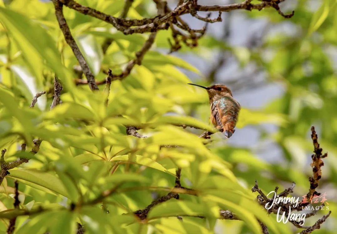 想来已是前天,洛杉矶植物园拍摄,巧遇铜喉蜂鸟,金阳普照下,项脖熠熠生辉,算是稀有品种,可惜姿式一般,不够灵动。