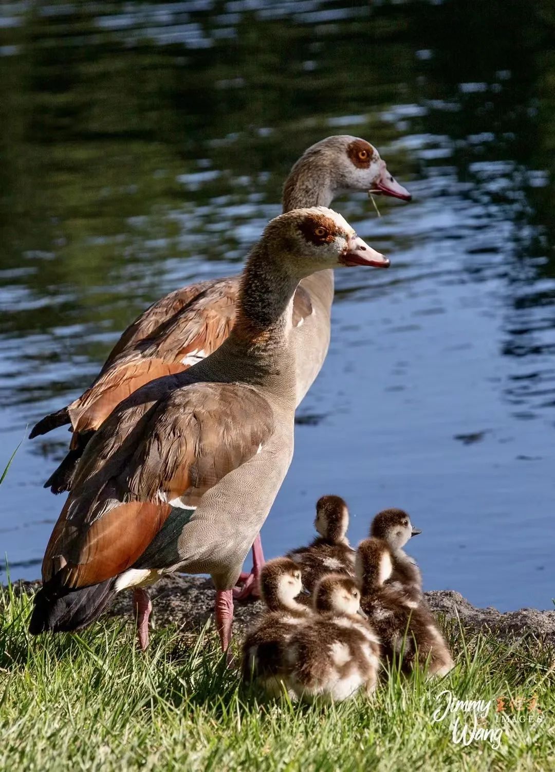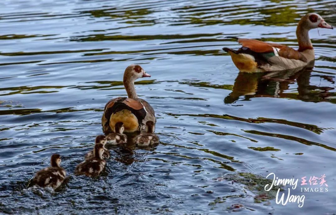 埃及雁,(Egyptian Goose),以及它们的孩儿们,该鸟的特色是眼窝处有一对似戴上墨镜的红眼圈。