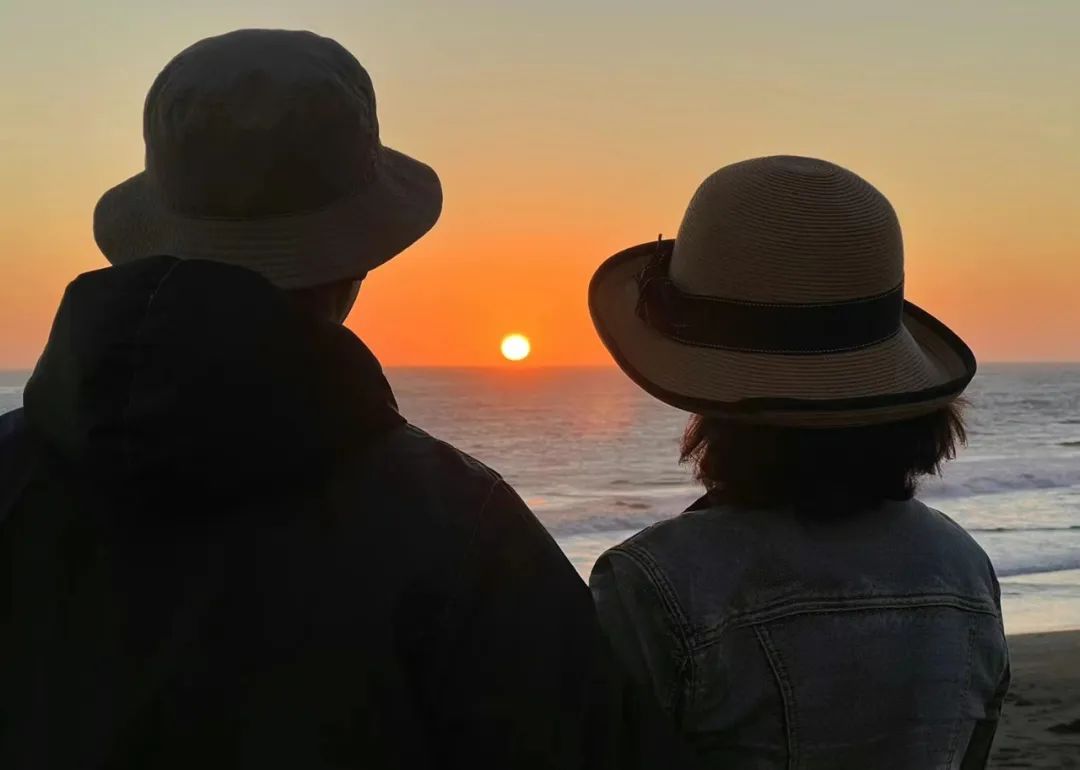 海边看夕阳、玩手机。落日余晖的海滨,海波温柔,爱意弥漫。