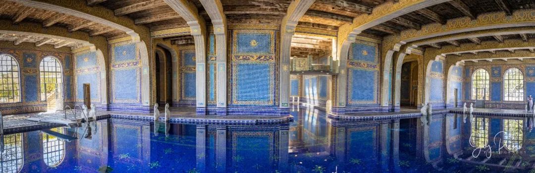 下面这张图是我用相机手持,四张接片而成的赫氏古堡室内罗马式游泳池。因为室内游泳池很广,镜头不够广,我用相机24-70mm的镜头从左到右一共拍了四张,分享给大家。英文是Hearst Castle, San Semeon, CA, 门票30美元。