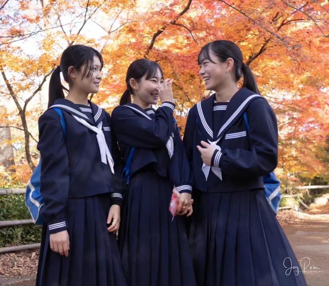 从古代起,日本人就把秋天看红叶叫做“红叶狩”。在他们看来,红叶像一头毛色华丽的野兽,当它嗅到一丝秋天的气息,就会以平均每天27公里的速度从北到南跑遍全日本,仅需50天左右,就能把这个狭长的岛国笼罩在它的浪漫里。每年初秋,日本气象局总要在红叶开始变红之前,郑重其事地向全国发布“红叶前线”,也就是“红叶变红时刻表”。11月,当秋叶的景色最为迷人时,日本全国各地都会举办各种各样的红叶节,形成特色红叶美食、红叶文化。红叶几乎哪儿都有,秋天的色彩斑斓到处可见。我们拍过美东秋色、科罗拉多金黄色的白桦林、卡多湖的水杉、莫斯科郊外的灿烂红叶,还有家门口的各种秋景,我们就是喜欢去追逐红叶与它相伴的有趣的景物。来到日本当然是奔着红叶而去。红色的毛茸茸小兽,我们狩猎来了。赏秋的季节,日本学校也安排学生集体秋游,我们一路看到很多学生穿着整齐的校服踏秋赏红叶。