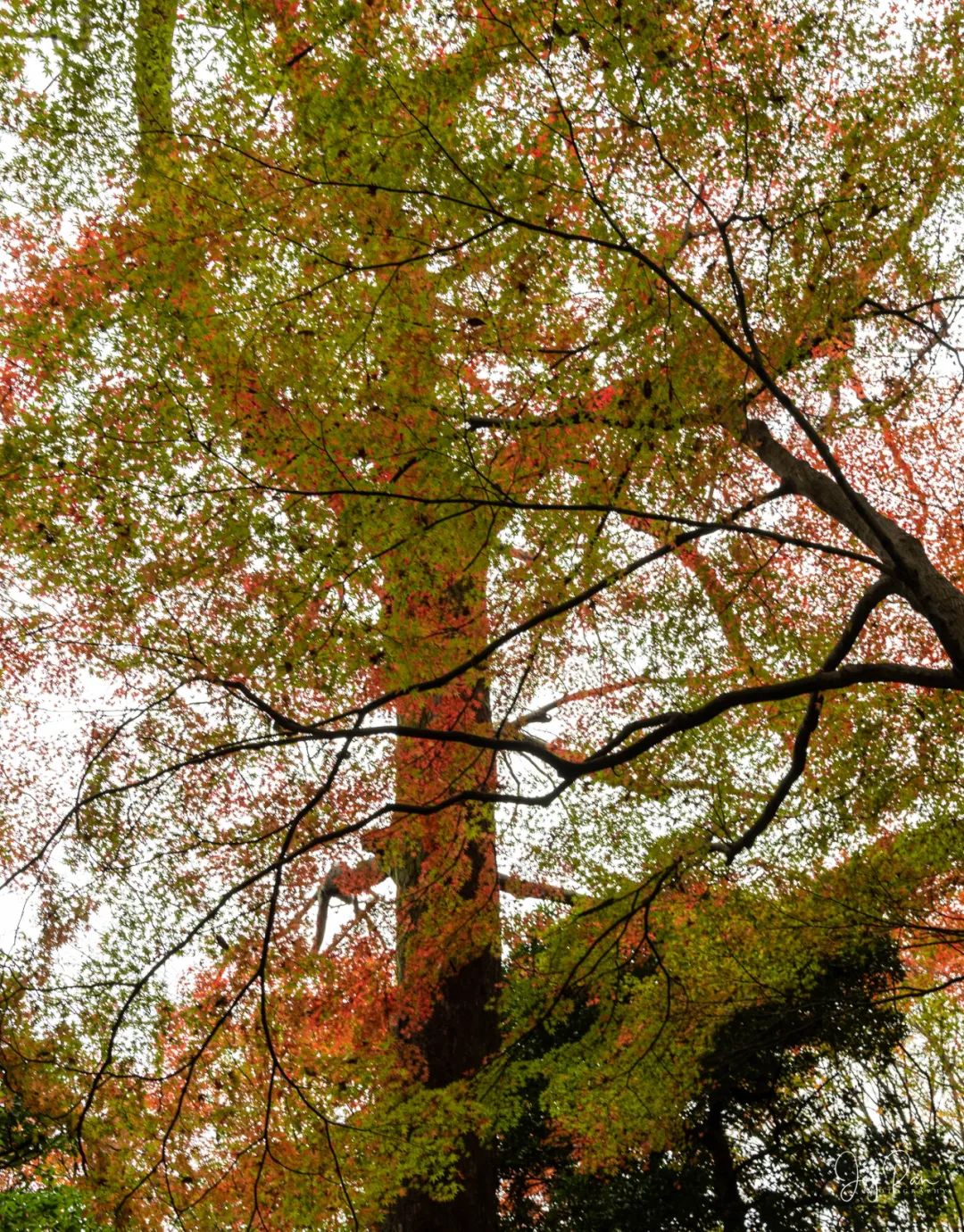 我们是看完了奔放热烈的京都红叶才来到东京的,对东京的红叶不抱任何期望,感觉除却巫山不是云。于是一些红绿夹杂的秋色特别吸引我的注意力。