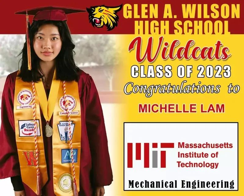 加州 Glen A. Wilson 高中 5月18日下午举行毕业典礼,华裔女生林雪诗(Michelle Lam)将持续书写她的两位姐姐创下的辉煌,成功被 MIT(麻省理工学院)录取,并将于九月入学。