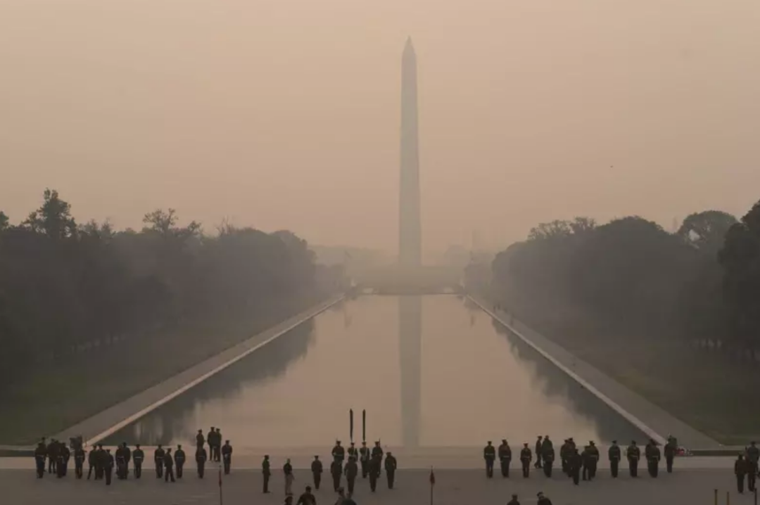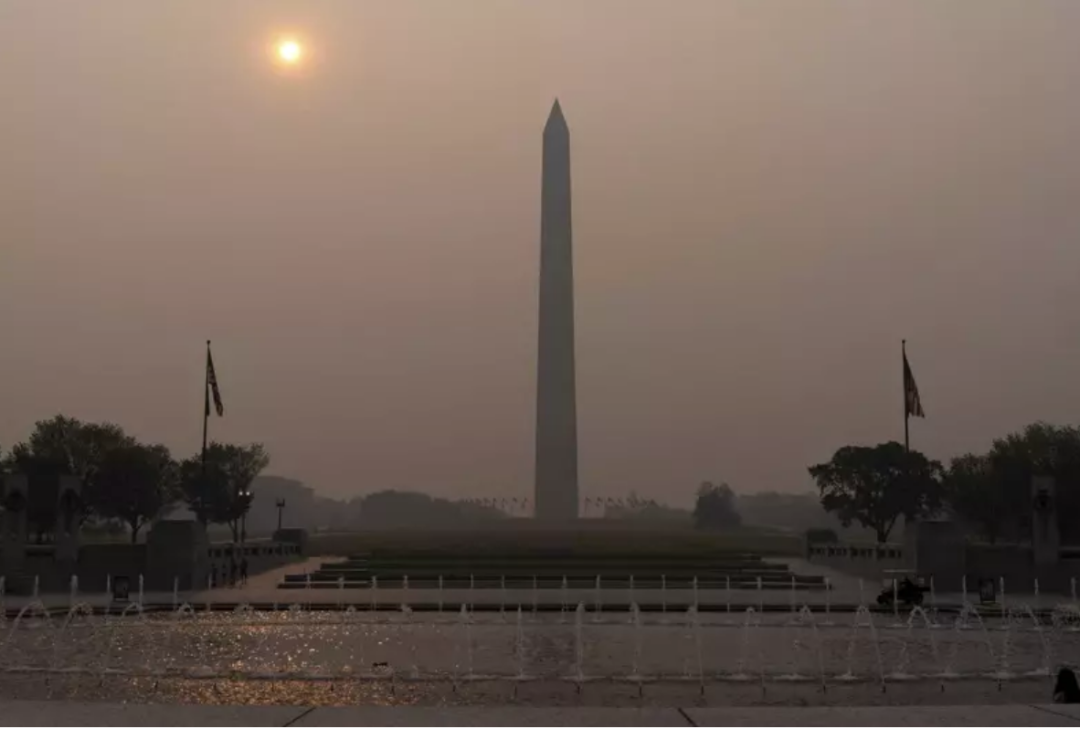 加拿大森林大火造成的空气污染跨越国境,导致美东许多地区空气品质急速下降,大华府地区8日也面临20年来最严重的空气污染,拉响空气“紫色警报”(Code Purple),呼吁有心脏或肺部疾病、年长者、儿童和青少年避免户外活动,普通民众也尽量待在室内,市长包瑟(Muriel Bowser)宣布收垃圾、铺路等非必要公共服务暂停。由马州、维州、华府联合成立的非营利机构“华盛顿都会区政府委员会”(Metropolitan Washington Council of Governments),8日对整个大华府地区发布空气质量紫色警报,建议民众待在室内,避免在室外有剧烈运动。空气品质指针(Air Quality Index, AQI)专门用于衡量空气清洁程度以及对民众健康的影响,根据AirNow,优良(Good)指数为0到50,意为基本无空气污染,对健康无风险,属于绿色等级;中等(moderate)指针为黄色,指数在51到100,空气品质良好,但可能对免疫力较弱或特别敏感的人群有风险;橘色意为空气品质对敏感人群不健康,指数在101至150,此阶段一般民众的健康仍不受威胁。红色等级为空气“不健康”(unhealthy),指数在151至200,部分户外活动可能对健康有风险,敏感人群在户外久了可能会有较严重的不良反应;紫色警报为空气“非常不健康”,指数在201到300,空气品质对所有人的健康都有危害;最严重的为栗色(maroon)等级,空气品质对人体健康“很危险”(hazardous),属于公卫紧急状况。马州过敏医生施莱伯(Rachel Schreiber)说,目前最明智的作法就是待在室内,大华府许多地区的公校近两日暂停学生的所有户外活动,华府暂停铺设道路、垃圾处理及资源回收等非必要(non-essential)服务,多郡市取消所有公园及户外文娱场所的项目,建议民众待在家中,华府国家动物园也因空气品质太差而关闭,华盛顿国民队(Washington Nationals)与亚利桑那响尾蛇(Arizona Diamondbacks)8日的棒球赛事也因此延期。大华府地区8日全面拉响空气紫色警报,图为被灰蒙蒙天空笼罩的华盛顿纪念碑。(美联社)马里兰大学大气和海洋学者狄克森(Russell Dickerson)说,加拿大的山火太大太烈,产生一种特殊的“火积云”(pyrocumulus),满是烟雾的空气上升到大气层高处,该区域让烟雾存在更久,且会随风飘到很远的地方。气象和公卫学者建议民众待在室内,避免空气污染危害健康。(美联社)气象学者约翰森(Veronica Johnson)说,上次华府面临红色等级以上的空气警报是2018年,当时是因臭氧(ozone)污染;2023年截至目前,华府共有六天面临空气品质橙色预警,此数量是2022年的两倍。狄克森说,干燥的天气会加重空气污染问题,大华府近期天气较干,部分地区有中度干旱的迹象,“若加拿大魁北克(Quebec)或附近地区有降雨,我们就不至于面临这么严重的空气污染。”来源:世界日报记者张筠
