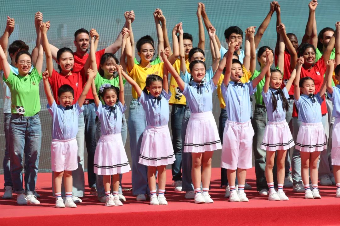 北京大学百周年纪念讲堂前的广场上,来自北京大学、四川大学、北京大学附属中学、北京大学附属小学、北京海淀小学、成都泡桐树小学的31名学子们共同演唱了成都大运会主题推广歌曲《爱是一样的》。