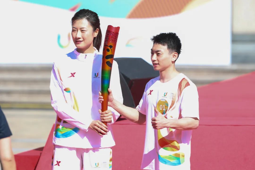最后一棒火炬手丁宁在进行火炬传递。