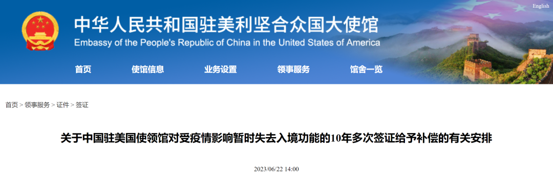 中国驻美大使馆宣布:赴华10年签可获补偿