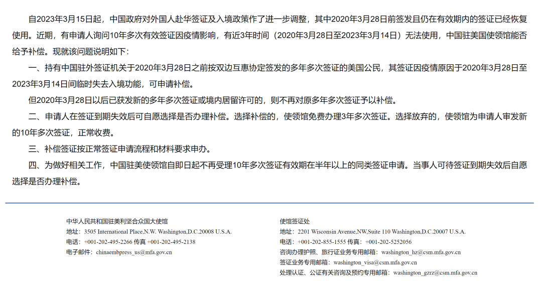近期,有申请人询问10年多次有效签证因疫情影响,有近3年时间(2020年3月28日至2023年3月14日)无法使用,中国驻美国使领馆能否给予补偿。现就该问题说明如下: