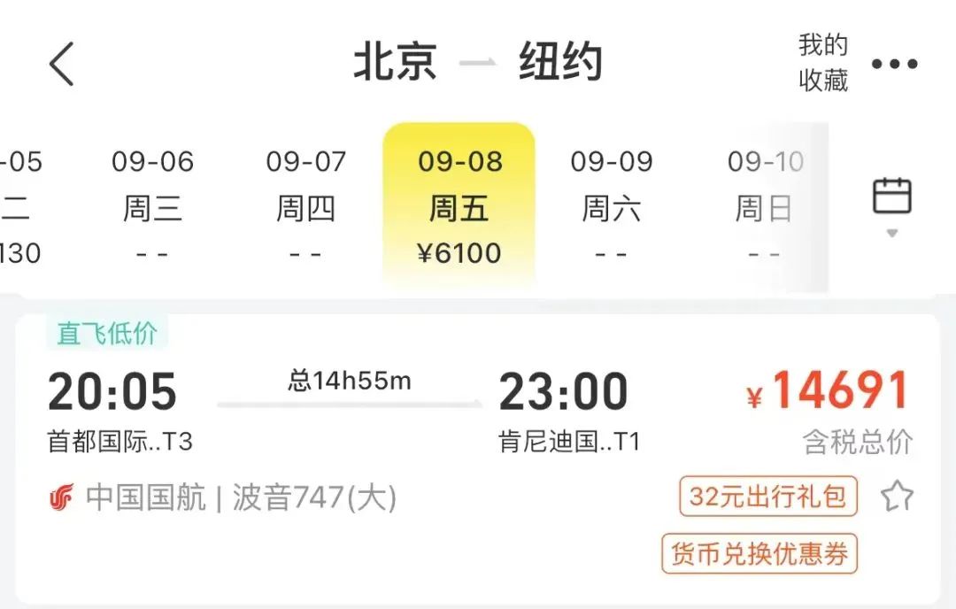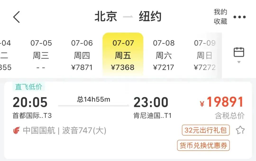 以下为北京直飞纽约,7-9月国航票价(票价有波动):
