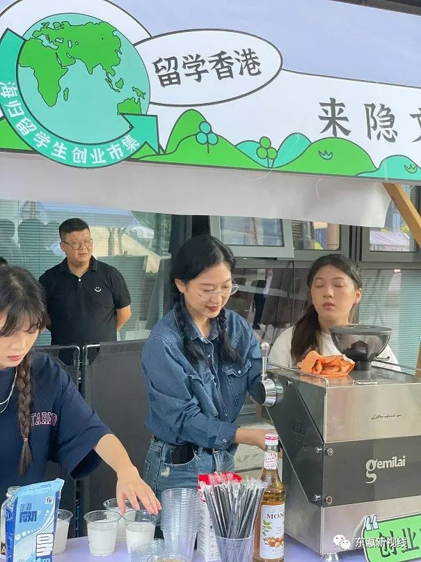 在这些展位中,其中一个可能是最特别也是最忙碌的:不同于其他人,它的创业者标注的是“留学香港”;忙碌则是因为它是现场唯一展示和提供咖啡的。只见一位戴眼镜、梳长辫,穿着牛仔制服的女生,动作娴熟地与旁边的咖啡师配合着忙个不停——没办法,她们现场制作的厚乳拿铁实在是太受欢迎了。