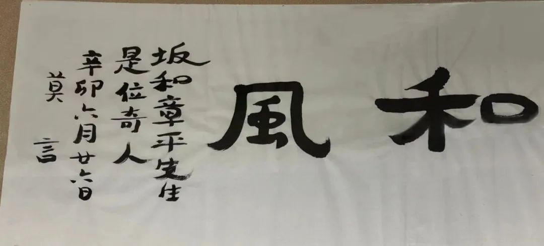 今年6月初的一天,在大阪电气通信大学王少锋老师的介绍下,笔者有幸拜会、采访了坂和章平先生。走进坂和章平的事务所会客厅,我一眼就注意到了莫言的题字——大写的“和风”,以及附在签名旁边、略微小一点的赠言:坂和章平先生是位奇人。
