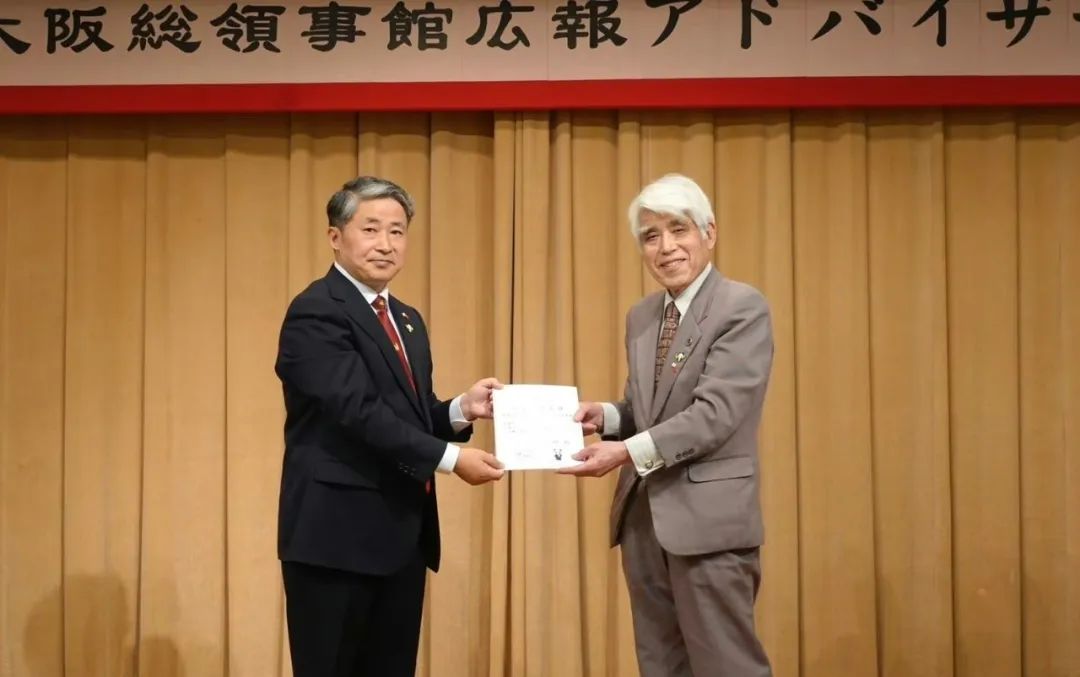 驻大阪总领事薛剑向坂和章平(右)亲自递上聘书