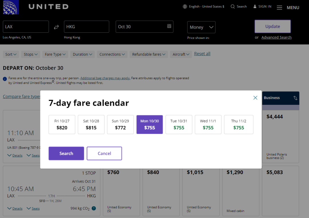 图:10月28日起,洛杉矶至香港航班(图源:美联航官网)